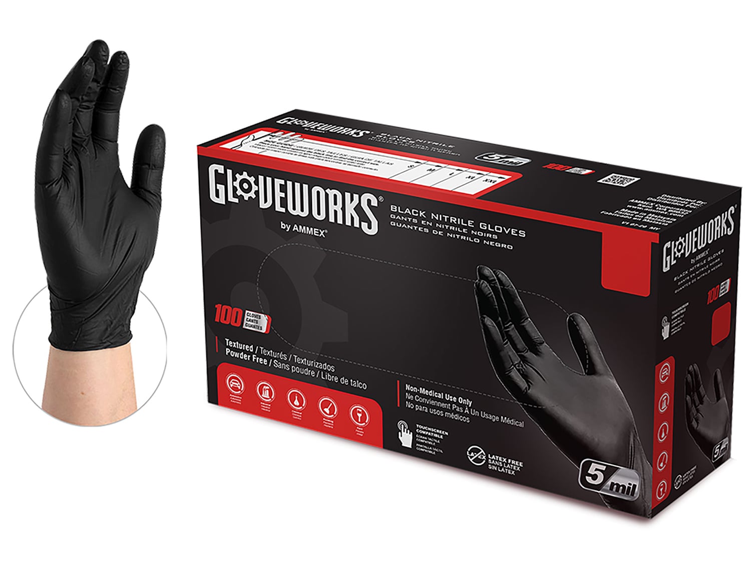 AMMEX’s Gloveworks Heavy-Duty Black Nitrile Gloves are powder-free, industrial-grade disposable gloves made from nitrile. They’re robust yet flexible and boast a raised diamond texture (RDT) that enhances grip and helps channel away liquids—ideal for demanding environments.