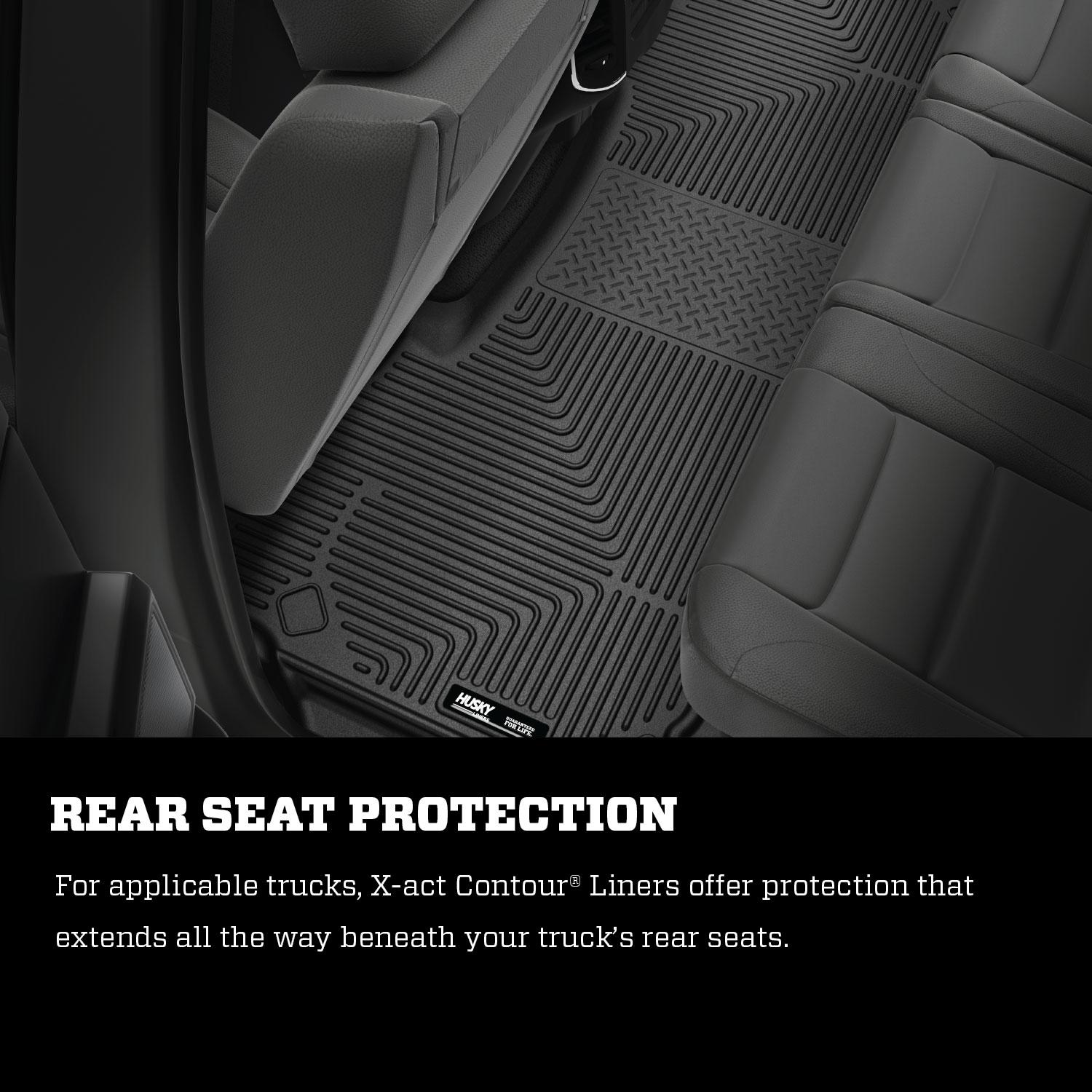 Exact fit with a no-slip, DuraGrip™ surface and a softer feel. Toughness never felt so soft, or fit so well Nothing fits your vehicle better or protects longer than Husky X-ACT Contour®. These liners combine laser-scanned, exact fit with a no-slip, DuraGrip™ surface and a softer feel. Plus, the rock-solid stability delivered by your vehicle’s factory retention posts, and our Stay-Put Nibs for a no-slip, no-slide, surface with absolutely zero compromise in protection. They’re built to stand up to whatever you’re laying down— including chemicals like battery acid and oil, with our FormFit Edge™ to keep whatever spills contained for easy cleanup. Available in black. Built for a lifetime of rugged abuse, warrantees the same.