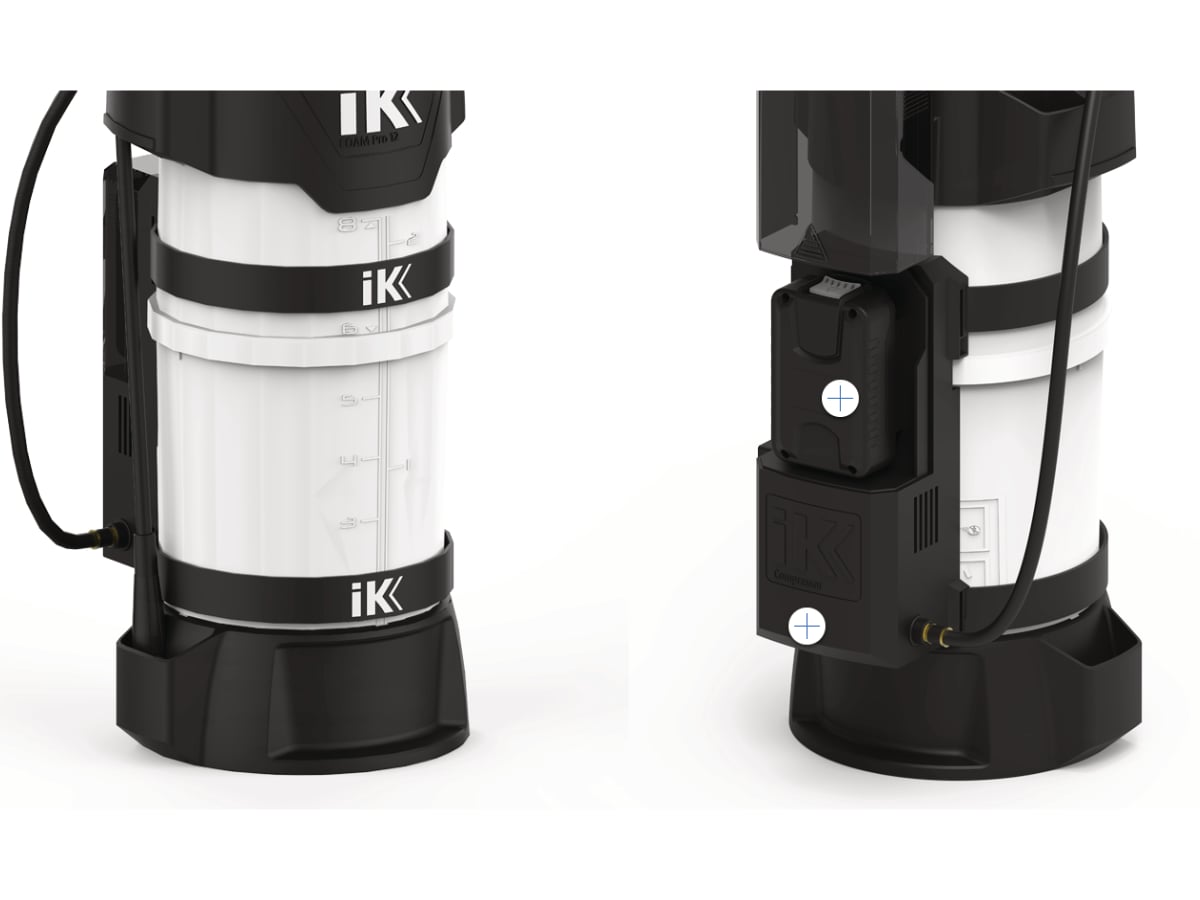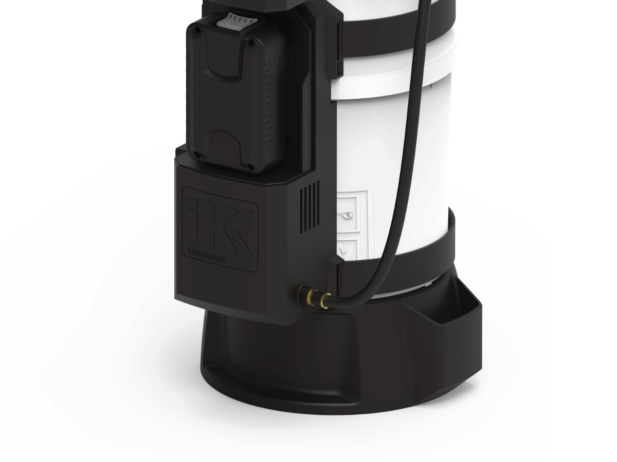 The IK Battery Compressor - 18V - 826789001 is a versatile, portable, and powerful 18V battery-powered air compressor designed to be attached to different IK Sprayers that contain the compressed air connector (excluding the foam pro 2 plus). The compressor, the device will quickly pressurize up to 2.5bar /36 psi without any eff ort for the user. Thanks to its large air flow, it can work continuously while maintaining pressure.