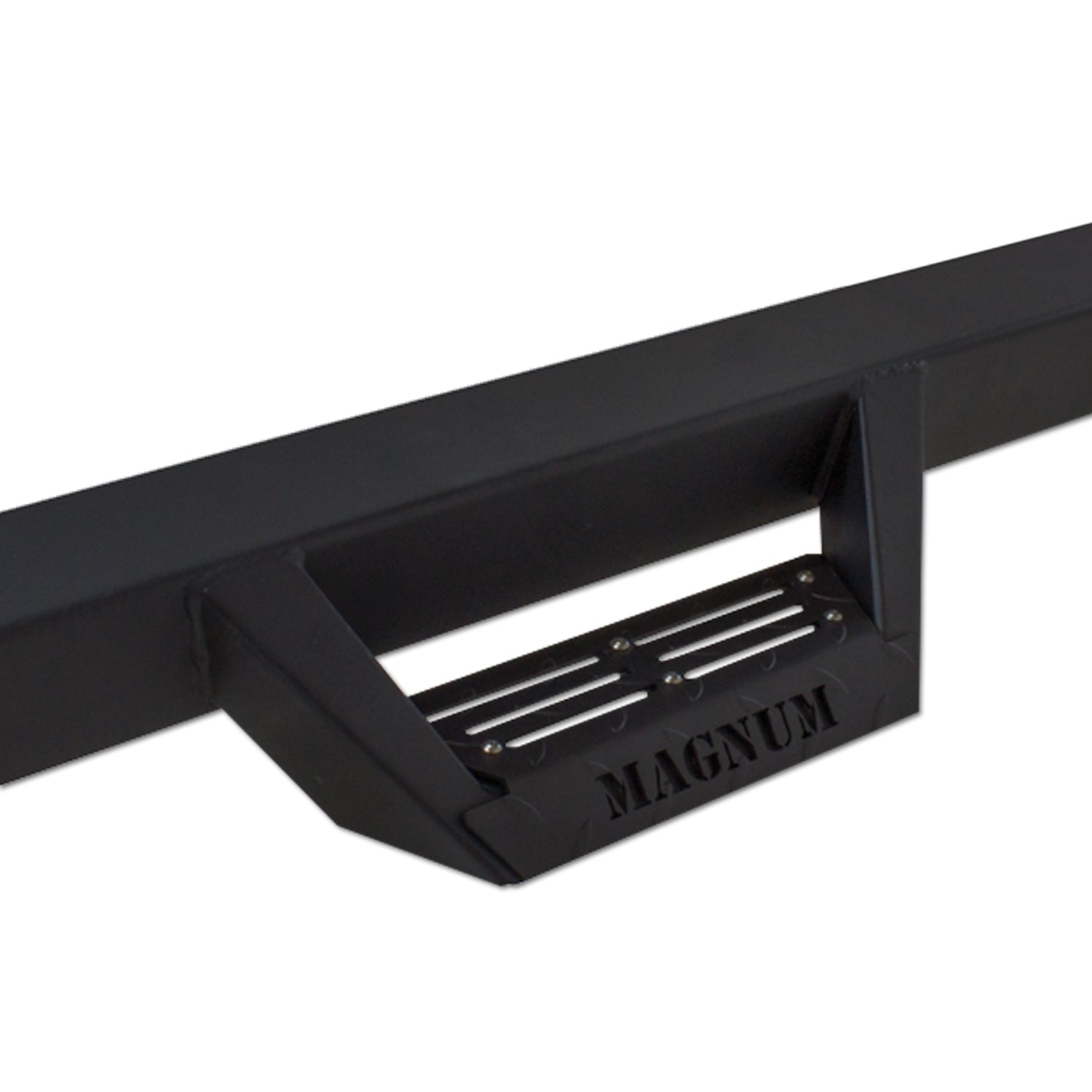 Magnum RT Steps give your truck a unique and rugged look. The Magnum RT side steps feature a sharp drop-down angled step design with a wide step area for easy entry and exiting of your truck. The side steps have a non-slip diamond tread pattern that allows drainage so that water, snow, or mud does not collect. The Magnum RT side steps fit to your vehicle's lower rocker, protecting from road grime or debris on or off the street. Made from 10 gauge steel and finished with a 3 stage black powder coating system. Quality guaranteed with a limited lifetime manufacturer warranty on the workmanship/structure and a 1 year limited manufacturer warranty on the black powder coated finish.