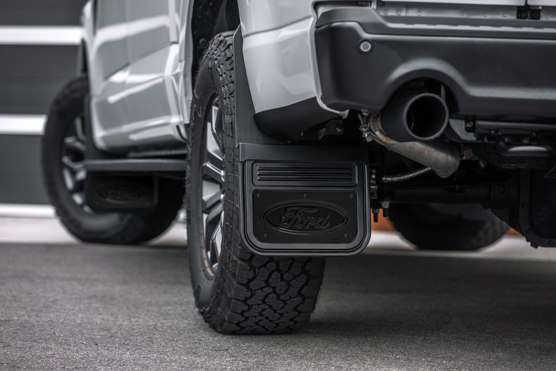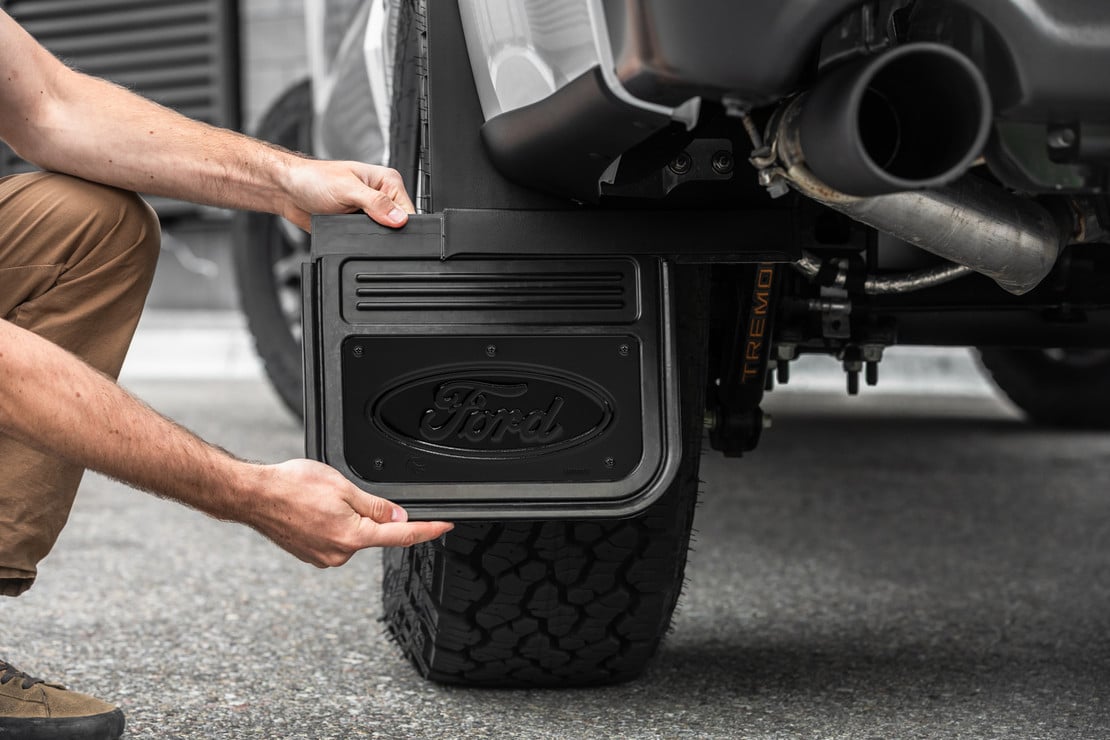 This Gatorback Offset Mud Flap set with Ford oval with black anodized aluminum plates is designed to fit perfectly. The flaps are 12.5" of heavy duty rubber and are attached to a custom fit bracket. The brackets are made from nylon/fiberglass material that gives them the durability you need. The brackets will not fade or chip and have the holes that line up with the factory fasteners already in them for a quick, simple install. The heavy duty rubber ensures that there will not be any debris that gets passed these flaps. These install inside the wheel well and have a 1.5" offset for both front & rear for extra tire clearance and come with all the hardware needed. An added feature of these flaps is the rubber portion is removable from the bracket via a built in channel to allow the flap to slide in and out for easy removal. This gives you the options for extra ground clearance if needed. Giving you the options for extra ground clearance if needed. When you remove the factory mud guard there will be a small hole in the fender that the fender plugs will cover. That is why the color of your truck is needed. The Truck Hardware Gatorback series mud flaps are the industries highest quality heavy duty mud guards! The rugged design and quality finish of these mud flaps make the perfect compliment to your truck. Featuring a 1/2" thick rubber flap, these mud flaps are sure to impress while they protect your investment.